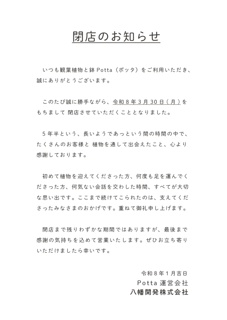 観葉植物と鉢 Potta(ポッタ) – ●新潟県柏崎市横山440-1 ハコニワ(ハコニワ入って左手奥) ⇒ハコニワHP ●TEL:0257-41-6477 ●FAX:0257-24-4056 – ●営業時間:10:00〜17:00 *2024年より閉店時間が変わりました ●定休日:火曜日